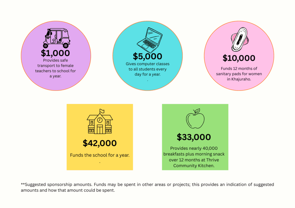 The following tables outline our forecast spending for existing TDP projects, based on expenses and data from 2025, for the 3-year-period targeted in this fundraising campaign (2026-2028). The figures are adjusted for predicted inflation, currency movements and known changes we are already accounting for such as adding new classes and staff at Wonderkids each year. The amounts for the 3 years were totalled and averaged to arrive at the figures shown as guides in our sponsorship amounts. (*All amounts are in Australian dollars.) This is how funds from this campaign will be spent.